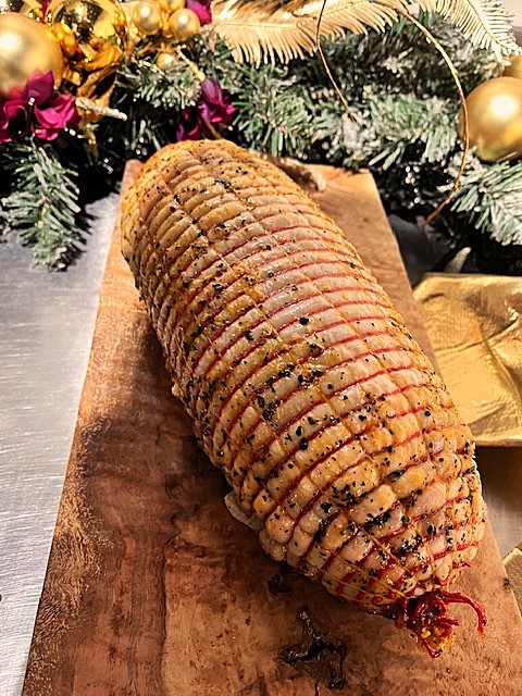 Met vakmanschap ontbeende poularde (kip) gevuld met onze huisgemaakte stuffing (ook te vinden in onze webshop)voor het kleine beetje extra hebben we de rollade gelakt met een truffel marinade